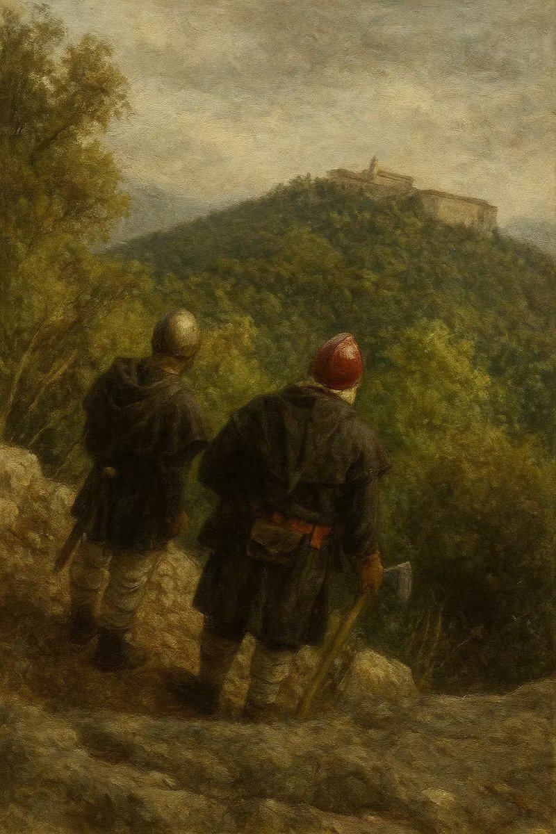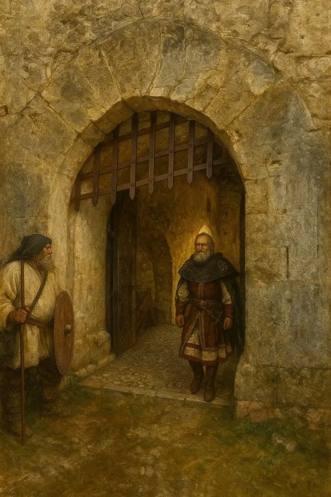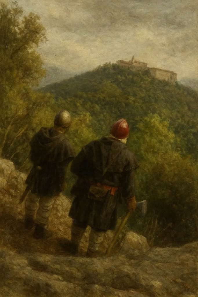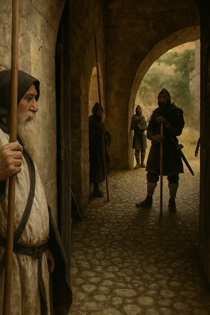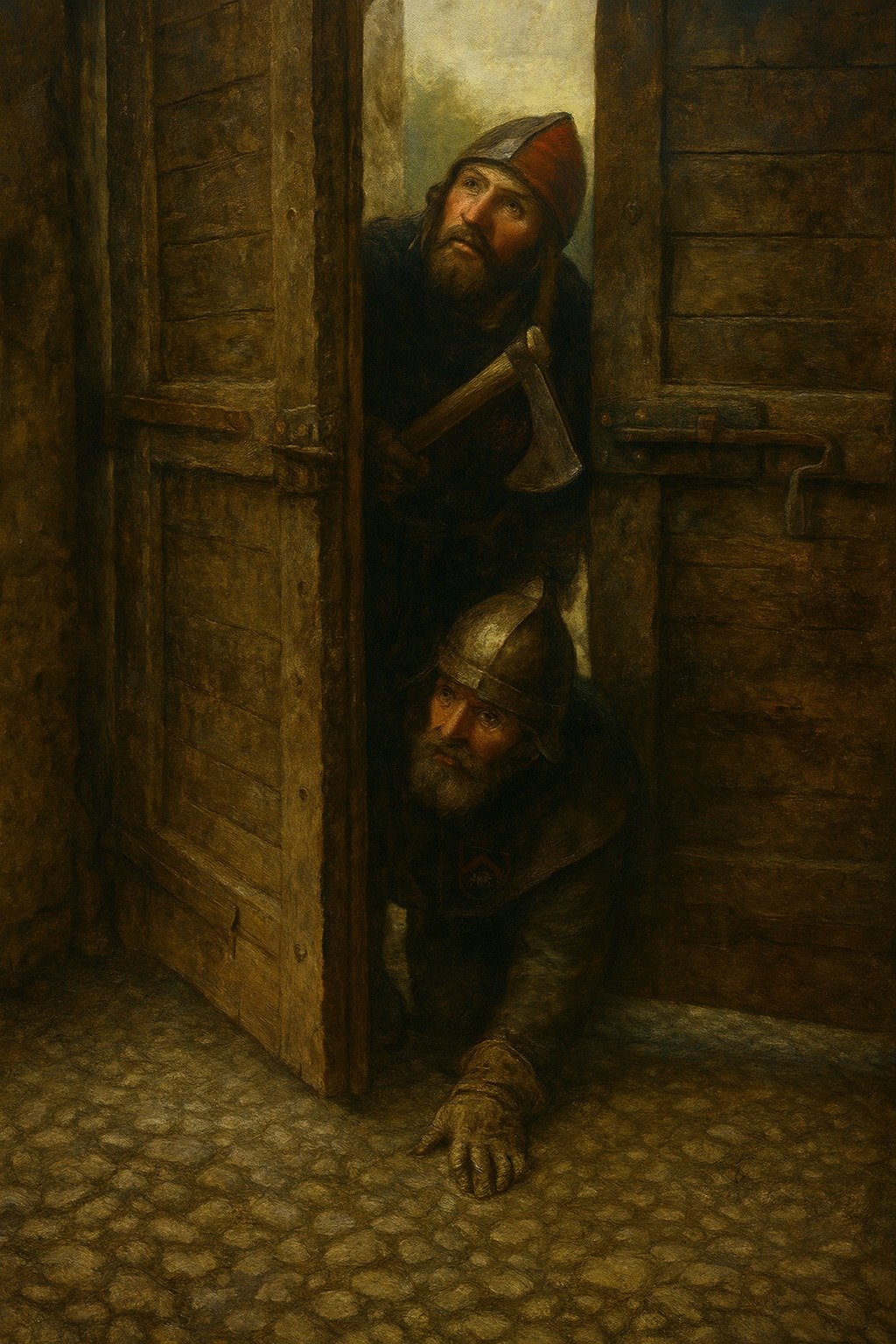 Rollo e Mangiafuoco sbirciano dal portone del Castello di Vicalvi