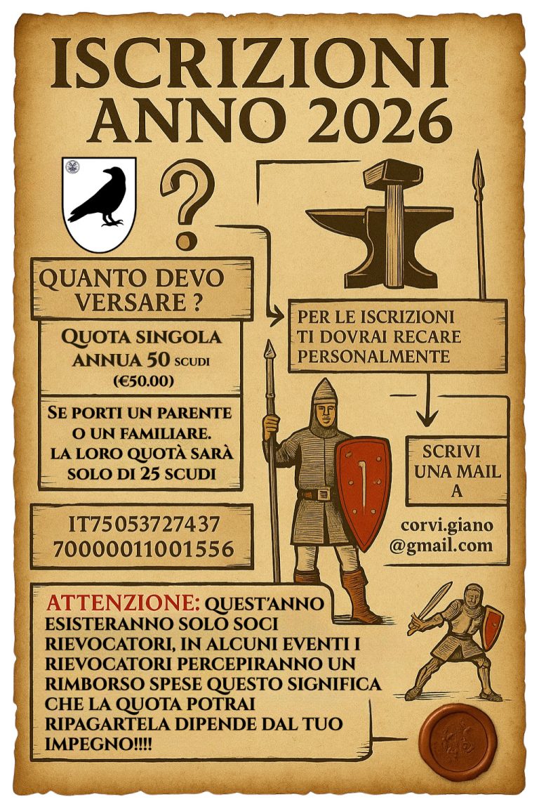 LA TESSERA DI SOCIO GARANTISCE, LA POSSIBILITÀ DI PARTECIPA-RE ALLA SCUOLA D’ARMI, AI LABORATORI E AGLI EVENTI REALIZZA-TI DALL’ASSOCIAZIONE COME RIEVOCATORE STORICO, ALL’INGRESSO GRATUITO A TUTTE LE INIZIATIVE CHE SI SVOLGERANNO ALL’INTERNO DELLA SEDE O IN ALTRI LUOGHI PER TUTTO IL 2025. AD OGNI NUOVA SOCIA E NUOVO SOCIO INTERESSATI A FAR PARTE DEL GRUPPO STORICO DI RIEVOCAZIONE LONGOBARDA, NEL PRIMO AN-NO DI ISCRIZIONE L’ASSOCIAZIONE FORNIRÀ TUTTO L’OCCORRENTE, SIA IN TERMINI DI CONOSCENZE TEORICHE E PRATICHE, SIA IN TERMINI DI EQUIPAGGIAMENTO E VESTIARIO. PER IL 2025 LA QUOTA D’ISCRIZIONE È DI 50 EURO E DEVE ESSERE VERSATA AL MOMENTO DELL’ISCRIZIONE. LA TESSERA DI SOCIO VALE FINO AL 31 DICEM-BRE 2025.